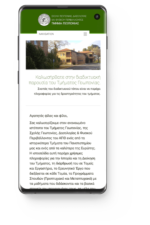 Ιστοσελίδα για τη διαδικτυακή παρουσία του Τμήματος Γεωπονίας, της Σχολής Γεωπονίας, Δασολογίας & Φυσικού Περιβάλλοντος του ΑΠΘ ενός από τα ιστορικότερα Τμήματα του Πανεπιστημίου και ενός από τα καλύτερα της Ευρώπης. - Πλατφόρμα site: