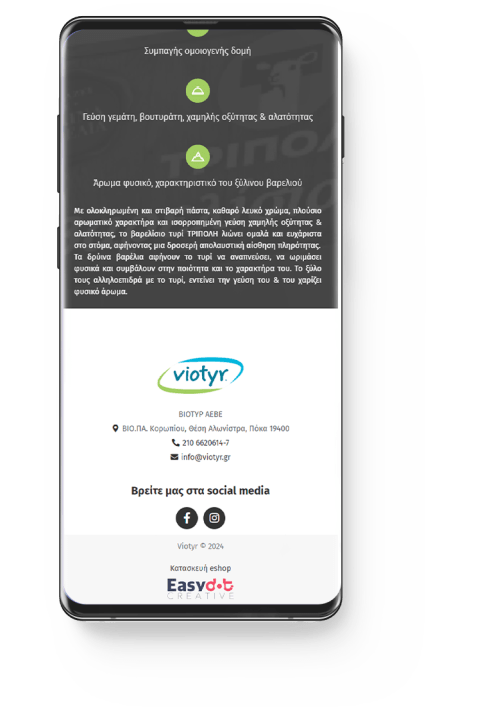 Η EASYDOT CREATIVE δημιούργησε το νέο eShop της VIOTYR που βασίζεται σε μια σύγχρονη πλατφόρμα e-commerce, η οποία προσφέρει πλήθος λειτουργιών και δυνατοτήτων. Το eShop είναι responsive, ώστε να προσαρμόζεται αυτόματα σε οποιοδήποτε μέγεθος οθόνης.